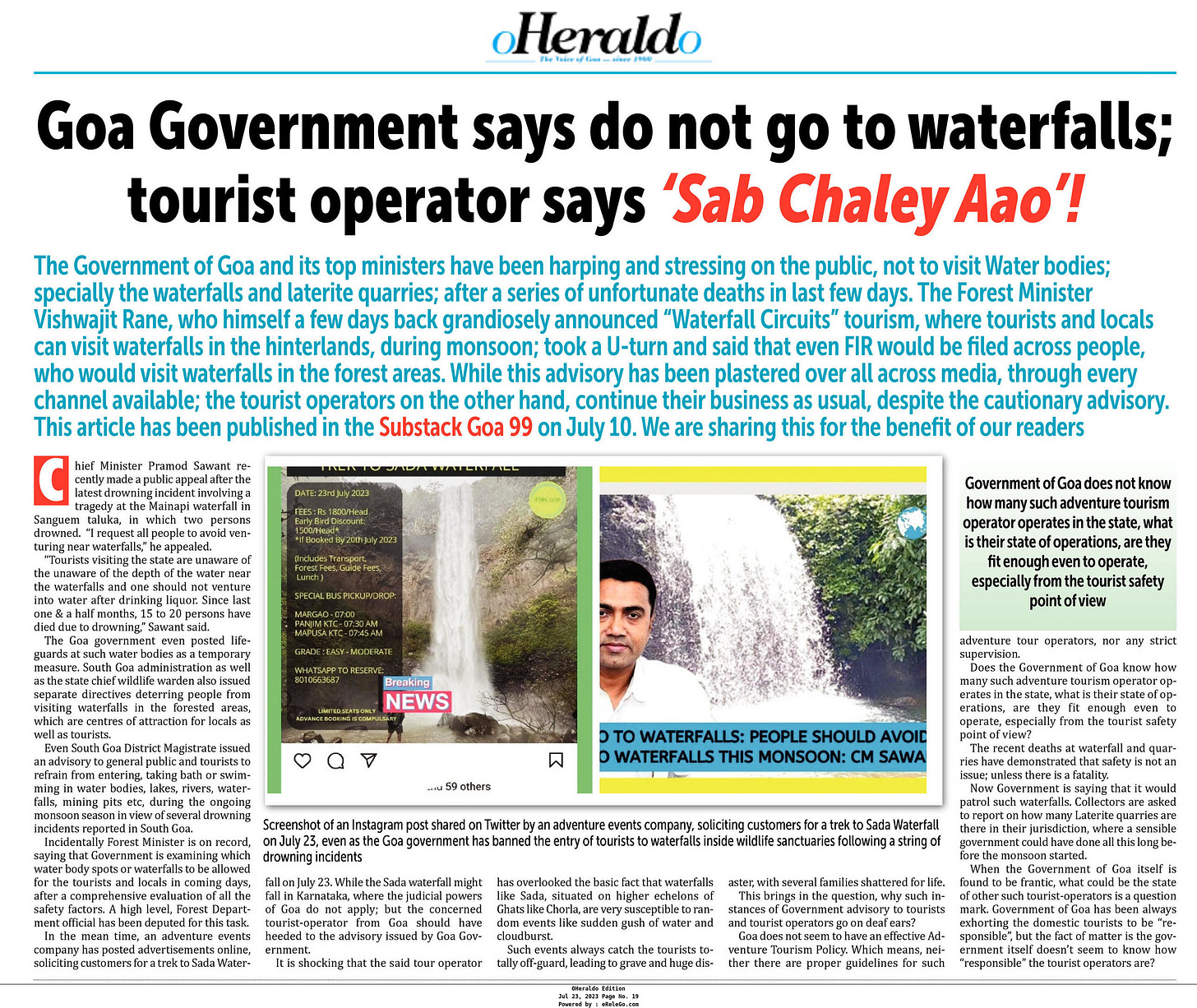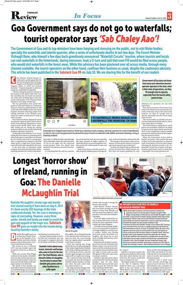 Herald Goa publishes articles on Danielle McLaughlin Trial and Waterfall Tourism of Goa.