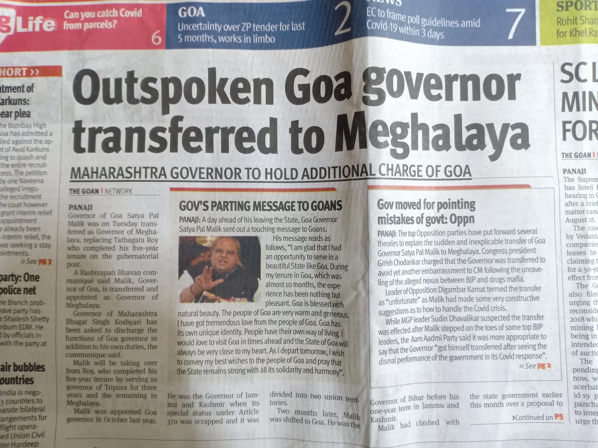 Mr.Satya Pal Malik, lived true to his name and always belligerently supported the truth, or the conquest of truth. He became such an irritant to the Pramod Sawant Government, that within 10 months he was transferred to far-flung Meghalaya.