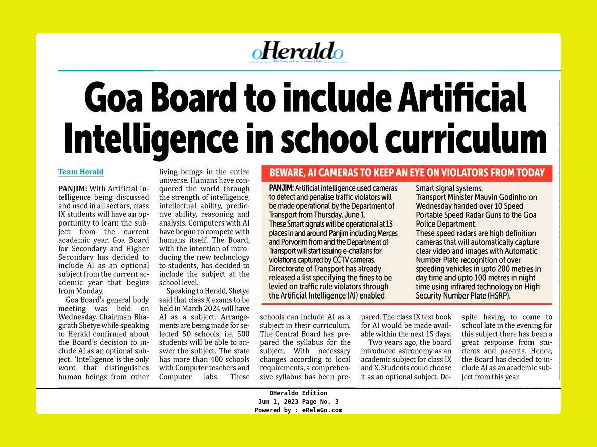 Goa Board for Secondary and Higher Secondary has decided to include AI as an optional subject from the current academic year that begins from Monday, 5th of June 2023.