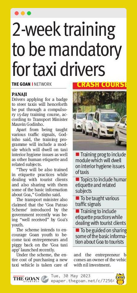 On 29th of May 2023, Monday; The transport Minister of Goa Mr.Mauvin Godinho announced that, henceforth all the drivers applying for a "Taxi Badge" would be required to undergo 2 weeks of mandatory training. While little detail regarding the training was provided, it left almost 99% of the queries unanswered.