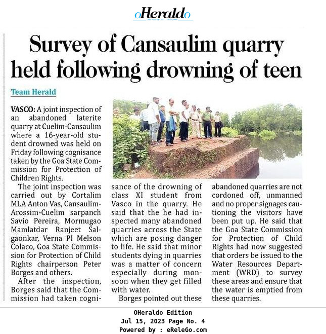 CITIZEN SAFETY : Hilarious proposal of State Commission For Protection Of Child Rights, to drain of all water from quarries.