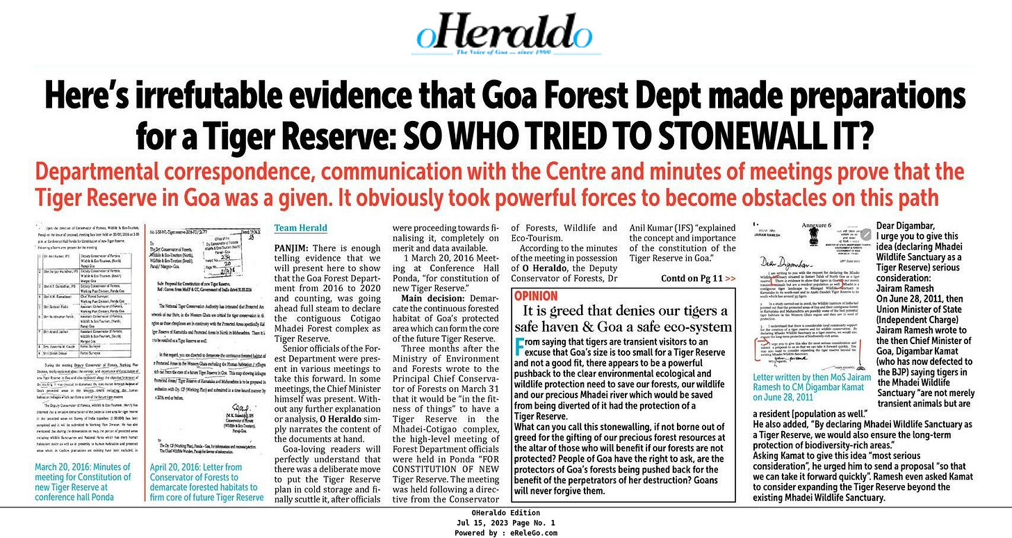 An excellent, eye-opening read, about the state of affairs in Goa. Known and promoted for it’s natural beauty, sold as a Paradise, world over by Government of Goa; but no to reserved forests and Tiger reserve. Why?