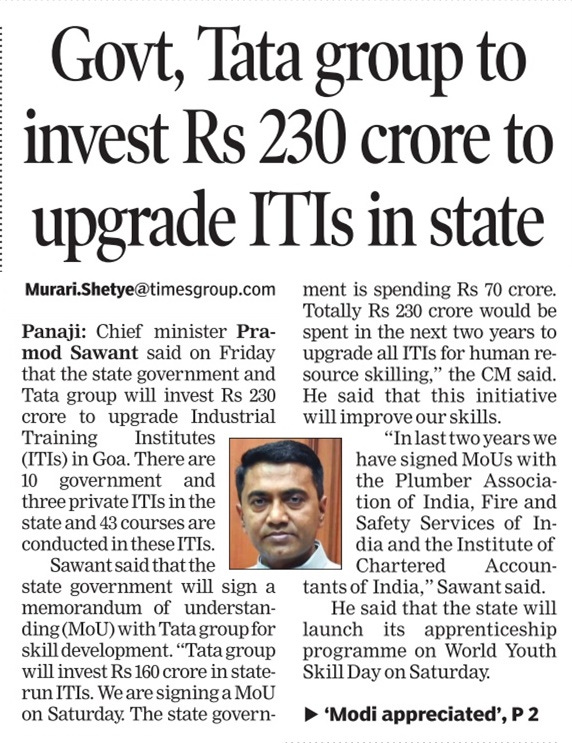 EMPLOYMENT : MoU with Tata Group for reinvigorating ITI’s in Goa is a welcome step.