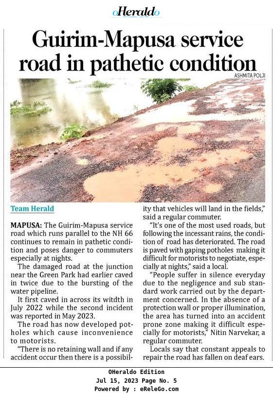 How can PWD Minister expect the two-wheeler drivers to navigate such roads in pouring rain? While, there is no other option, the residents of Guirim must suffer the agonising ride, not only putting their safety at risk, but also, of their vehicles.