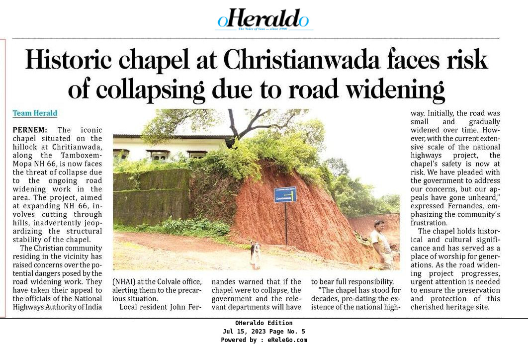 The danger to historic chapel located at Christianwada on the NH66 highway, is the classic case of how ill-planned and ill-executed “development” is, presently spear-headed in the state.