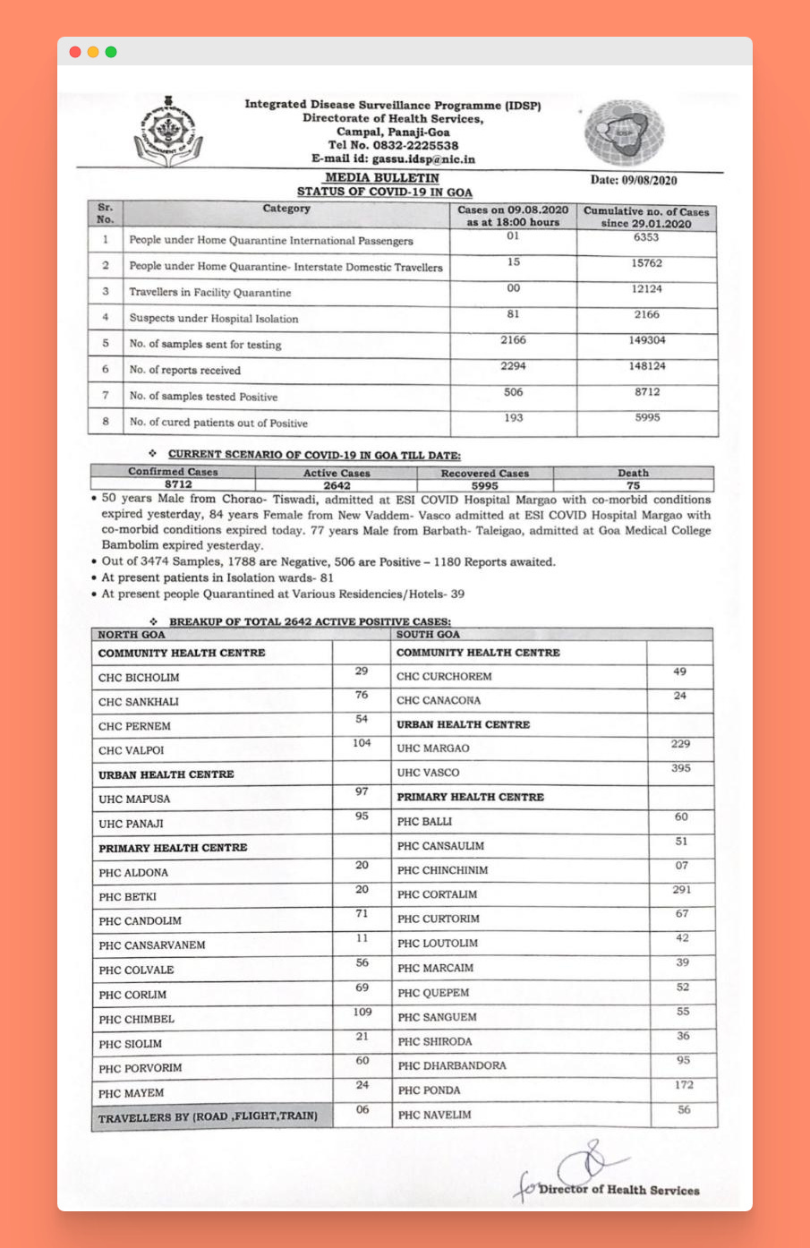 6. As on 10th August 2020, Goa had 8,712 confirmed Covid-19 +ve cases, 2,642 ACTIVE, and 75 people have died (officially).