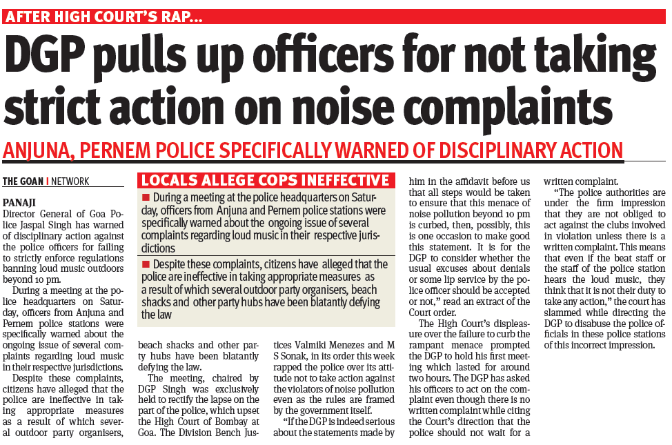 Goa Police hand-in-gloves with all these establishments, always turned a blind eye, unless and until, The High Court Of Bombay made , The Director General of Police (DGP Goa) personally responsible for any further "noise pollution" which were in blatant contravention of Honourable Courts's order.